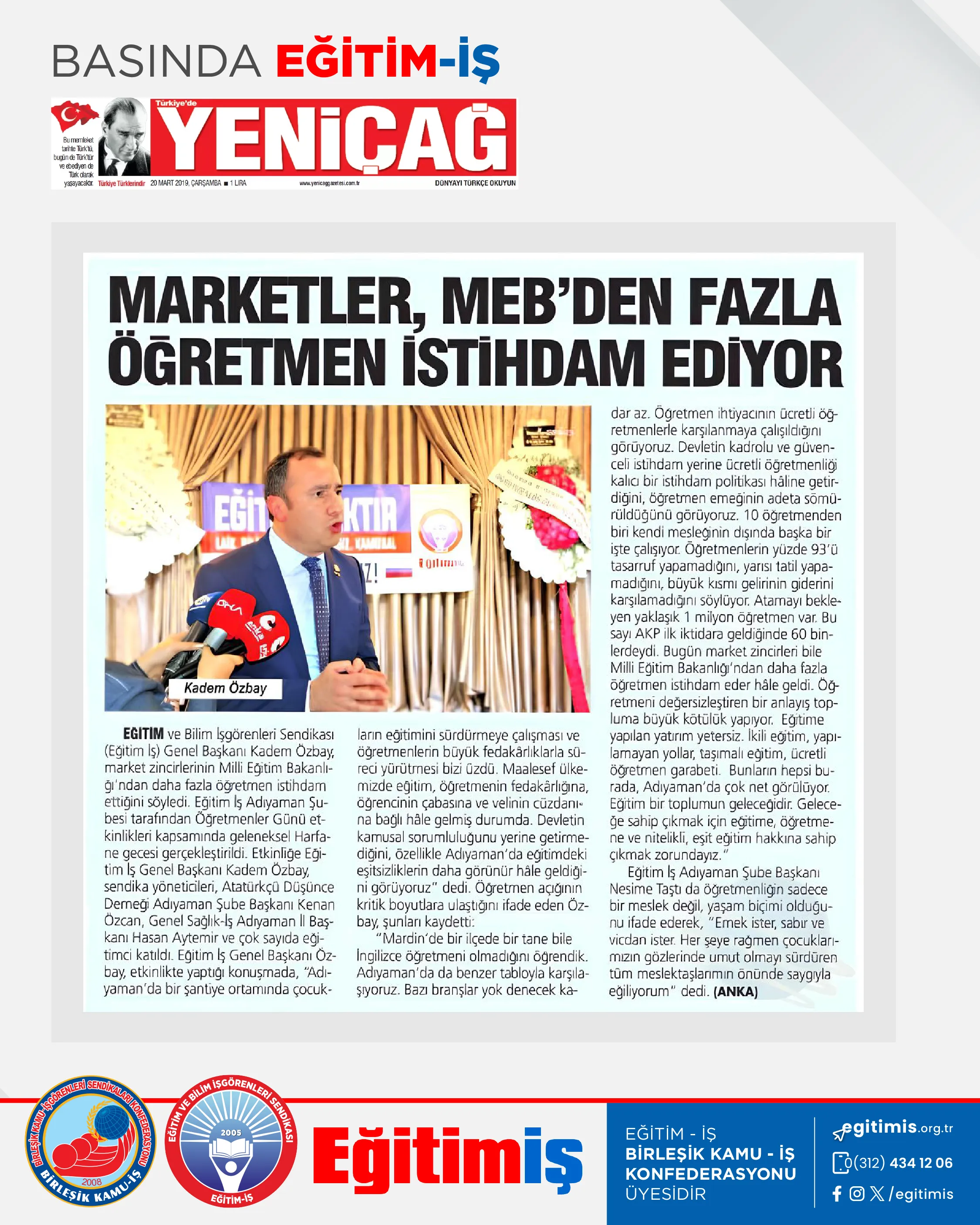 Genel Başkanımız Kadem Özbay’ın, öğretmen istihdamı sorununa ilişkin değerlendirmeleri Yeniçağ’da yer aldı.