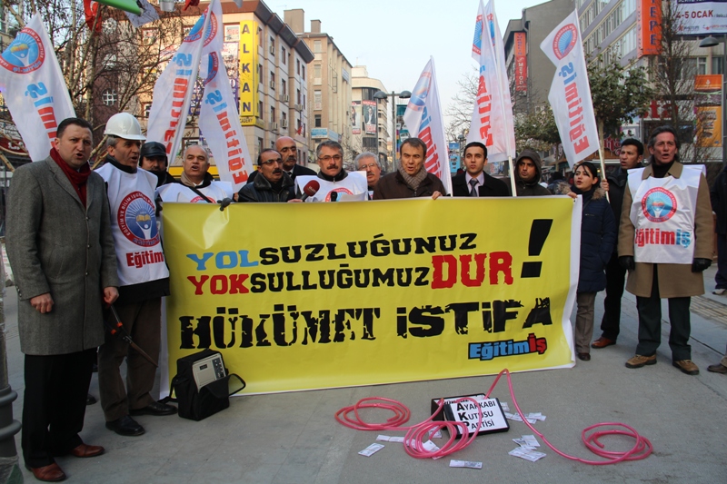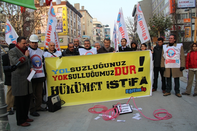 Eğitim-İş Genel Sekreteri Şenol Eyüboğlu burada yaptığı basın açıklamasında, Türkiye genelinde tüm Eğitim-İş binalarına “Yolsuzluğumuz, Yoksulluğumuzdur. Hükümet İstifa” yazılı pankartların asıldığını belirtti. Aksaray’da sendika binasına asılan pankartın ise Valilik emriyle kaldırıldığını söyleyen Eyüboğlu, “Bir pankarttan bile korkan hükümetle karşı karşıyayız” dedi.