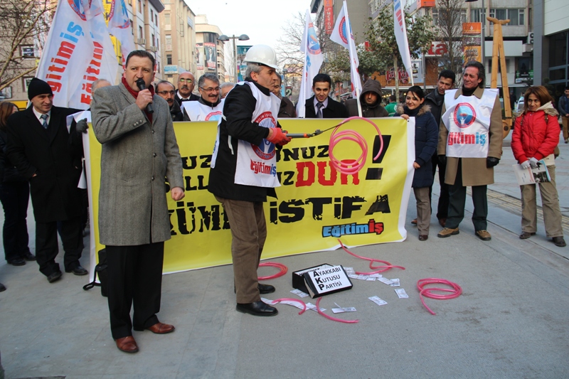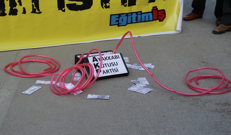 Eğitim-İş Genel Özlük ve Hukuk Sekreteri Ömer Arslan, Genel Eğitim Sekreteri Mehmet Akıncı, Genel Basın Yayın Sekreteri Barış Düdü, Ankara 1 No’lu ve 2 No’lu Şube Yönetim Kurulu üyelerinin katılığı eylemde, üzerinde “Ayakkabı kutusu partisi” yazan ve içinde dolarlar bulunan kutuya giren hortumlar, “AKP’nin hortumlarını emekçiler kesecek” diyerek kesildi.