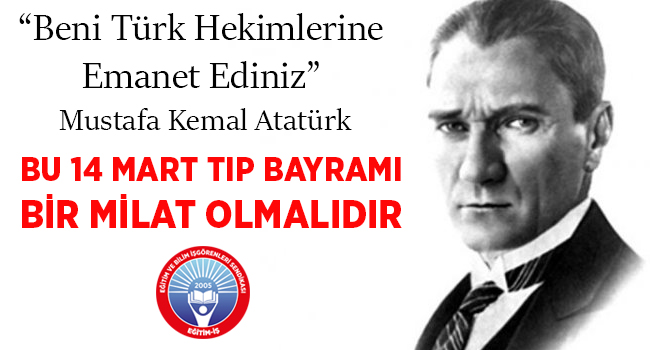 Büyük Önder Mustafa Kemal Atatürk’ün “Beni emanet ediniz” dediği Türk hekimlerinin 14 Mart Tıp Bayramı’nı kutluyor, bu 14 Mart’ın onların çalışma yaşamlarının iyileşmesi için bir milat olmasını diliyoruz.