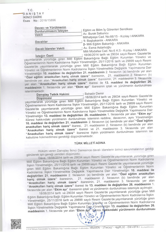 Uygulamanın yanlışlığı konusundaki tüm itirazlarımıza rağmen MEB’in geri adım atmaması üzerine 25.11.2016 tarihli bu düzenlemeye karşı da dava açtığımızı duyurmuştuk.