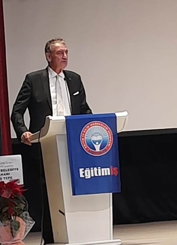 "Atatürk Cumhuriyetin Öğretmenlerine çok büyük sorumluluklar yüklemiştir. Ama bugün öğretmenlerimiz yoksulluğa mahkûm edilmiş, mecburi istikamet gösterilen bir sınava tabi tutulmuştur. Hiçbir öğretmenimizin bir unvan sahibi olmak için bu sınava girdiğini düşünmüyorum. Ekonomik tükenmişlik içindeki öğretmenlerimizle -istiyorsanız girmeyin- denilerek dalga geçilmiştir. Biz mesleğimize yapılan bu hakareti unutmayacağız. Biz öğretmenler Cumhuriyet dersini anlamayanlara o dersi vereceğiz. Bursluluk sınavına girmiş öğrenci konumuna soktuğunuz öğretmenler gereken dersi sizlere verecektir. ‘Milletleri kurtaranlar yalnız ve ancak öğretmenlerdir. Öğretmenden, eğiticiden mahrum bir millet, henüz bir millet adını alma yeteneğini kazanamamıştır.’ diyen ve sınıfta öğretmenin önüne geçmeyen bir liderden, Başöğretmenimiz Mustafa Kemal Atatürk’ten bugün, öğretmenlere ‘çapulcu, trol, süfli’ diyen bir lidere geldik ki bu tablo öğretmenlik mesleğinin nasıl itibarsızlaştırıldığını görmemize yetiyor da artıyor."