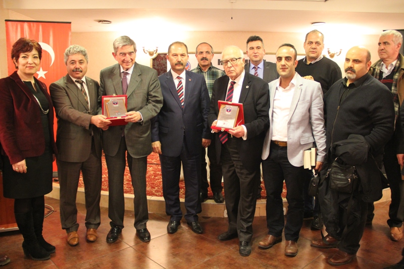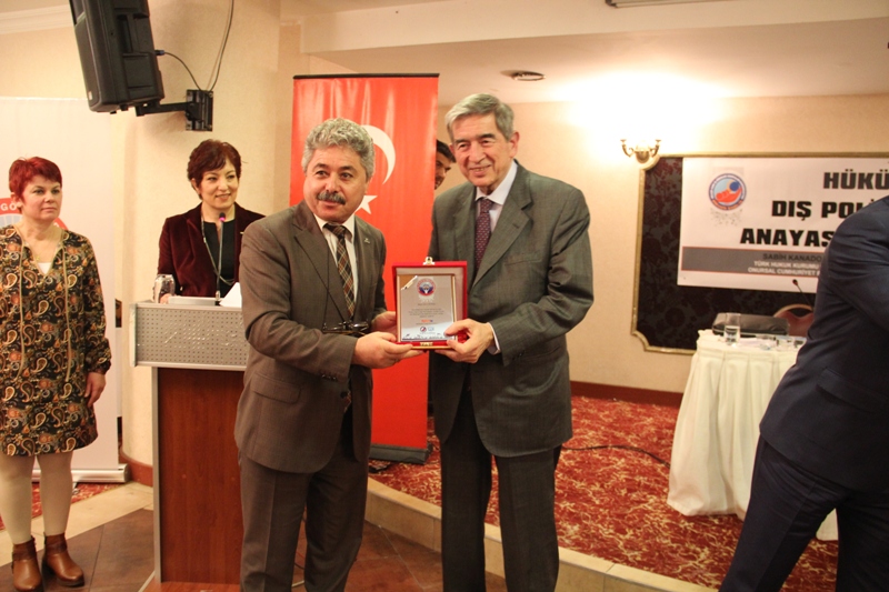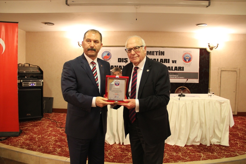 Panelin sonunda, Genel Başkanımız Veli Demir, Kanadoğlu’na; Genel Sekreterimiz Mehmet Altıntop ise Öymen’e plaketlerini sundu.
