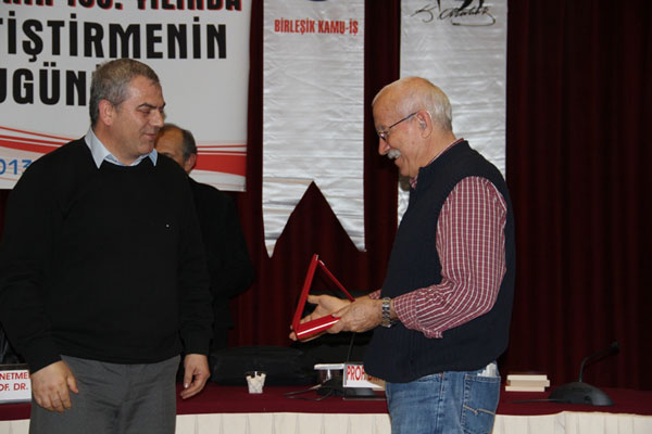 Panelin ardından Birleşik Kamu-İş Örgütlenme Sekreteri Hasan Kütük, Kültür Sanat-İş Genel Başkanı Şahin Çulcuoğlu ve Genel Başkanımız Veli Demir, konuşmacılara plaketlerini sundu.