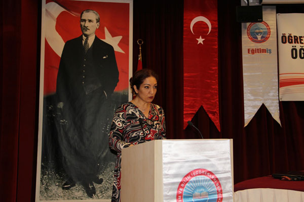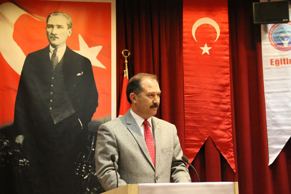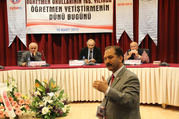 Açılış konuşmasını yapan Genel Başkanımız Veli Demir, nitelikli eğitimin ancak nitelikli öğretmenler yetiştirmekle mümkün olduğunu vurguladı ve “Ülkenin geleceği, iyi yetişmiş ve mesleğinde söz sahibi öğretmenlere bağlıdır. Ancak o zaman ‘fikri hür, vicdanı hür, irfanı hür’ kuşaklar yetiştirilebilir” dedi. Osmanlılarda örgün eğitim kurumlarının, sıbyan mektebi ve medreselerden oluştuğunu belirten Demir, II. Mahmut’un “İstanbullular için ilköğretim zorunludur” sözleri ile öğretmen yetiştirmenin 1824 yılında gündeme geldiğini söyledi.
