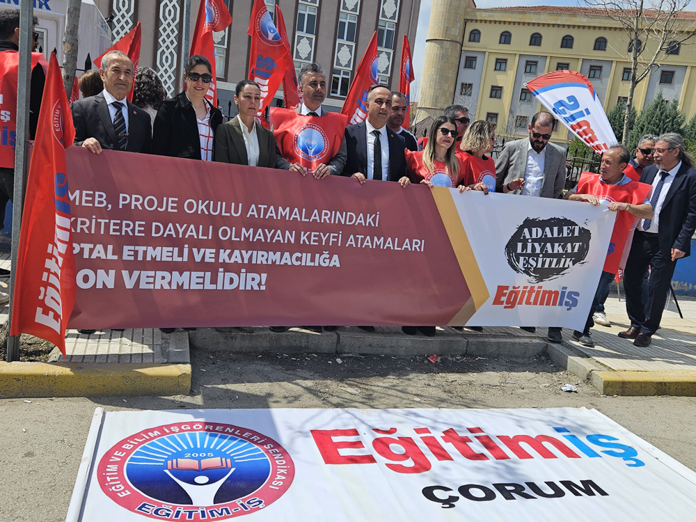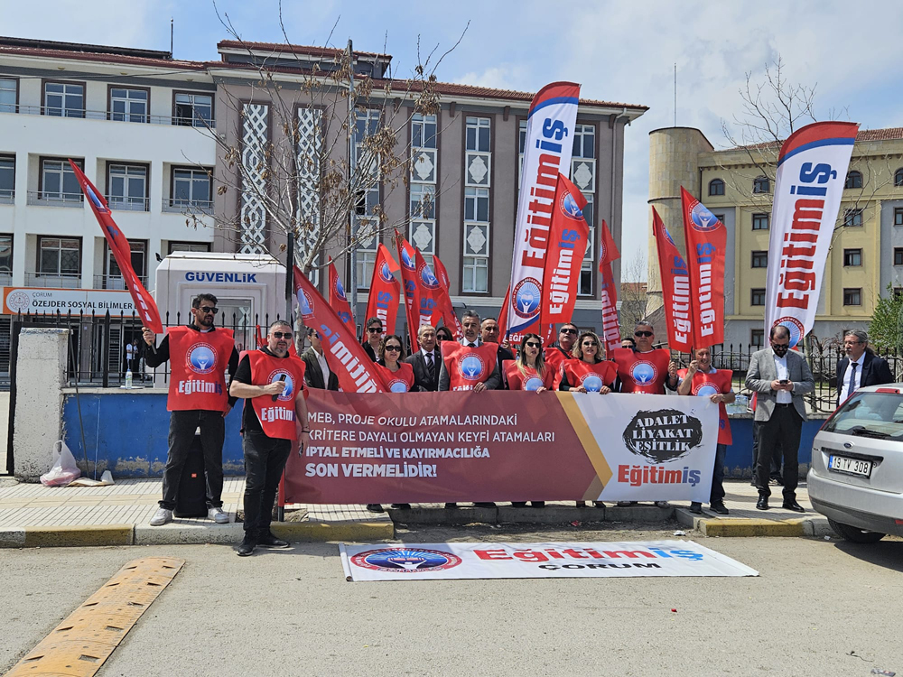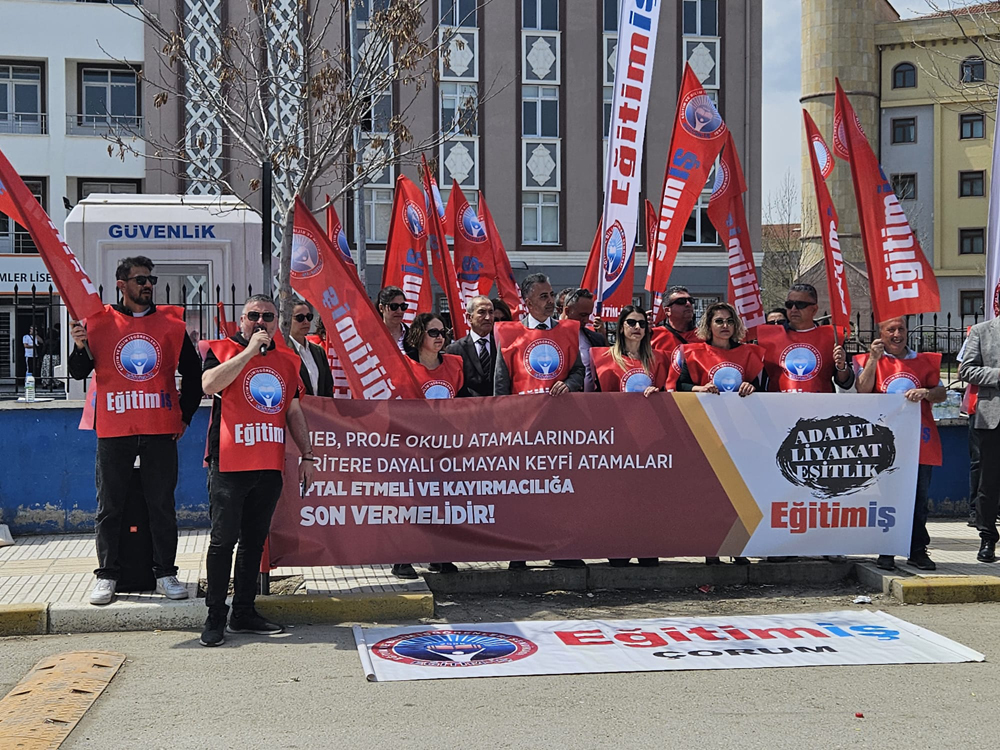 Eğitim-İş olarak, geçtiğimiz hafta proje okullarına yapılan öğretmen atamalarını protesto etmek için gerçekleştirdiğimiz basın açıklaması sırasında, Çorum’daki 15 Temmuz Temmuz Şehitleri Fen Lisesi ve Özejder Sosyal Bilimler Lisesi’nde öğrencilere yapılan baskıyı protesto ettik.