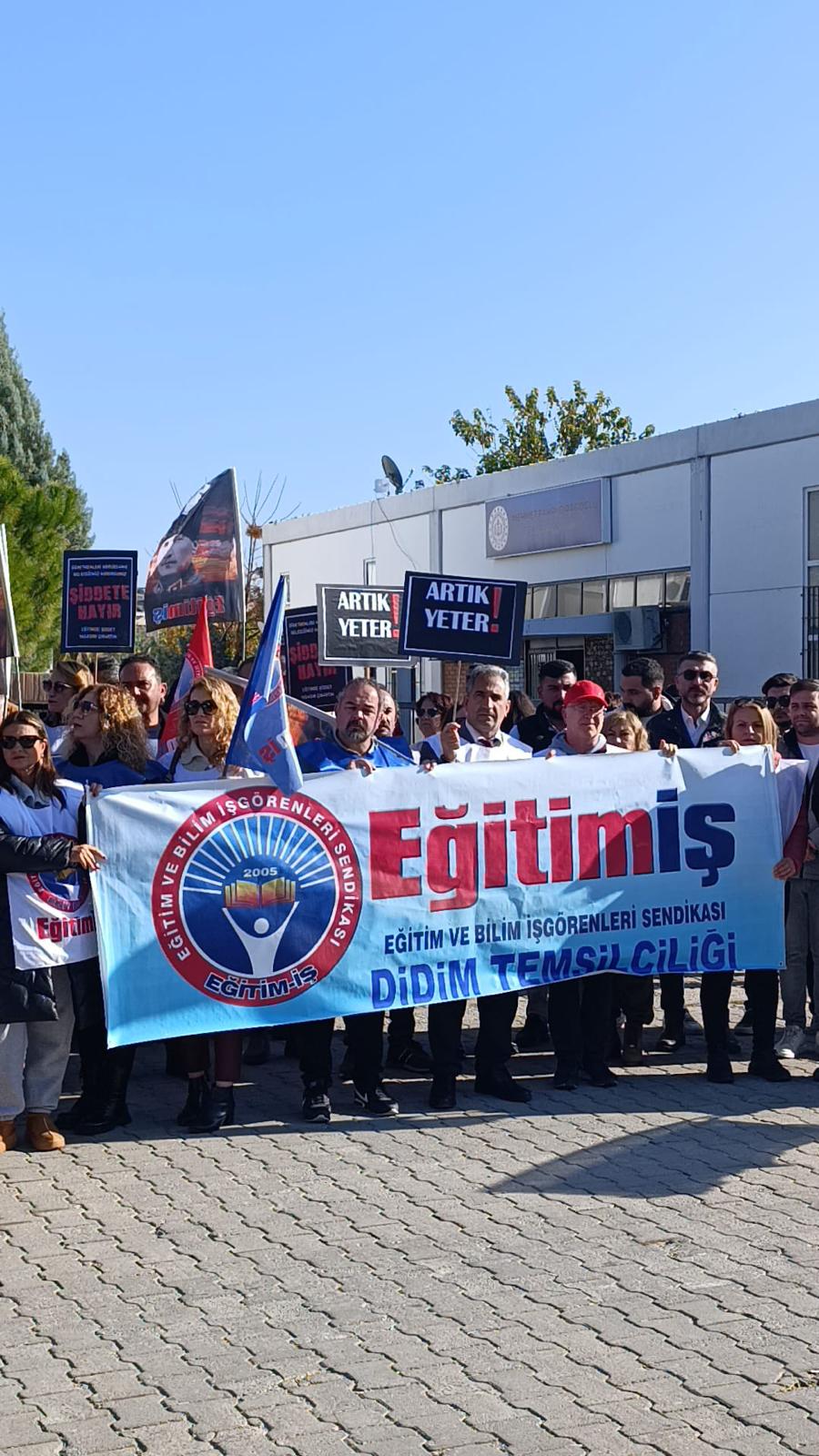 Aydın'ın Didim İlçesinde Valiler İlkokulunda görevli öğretmene yönelik şiddete ilçede bulunan sendikalar ortak basın açıklaması ile protesto etti. Didim ilçe Temsilciliğimizinde katıldığı protesto eyleminde okunan ortak metin şu şekilde;