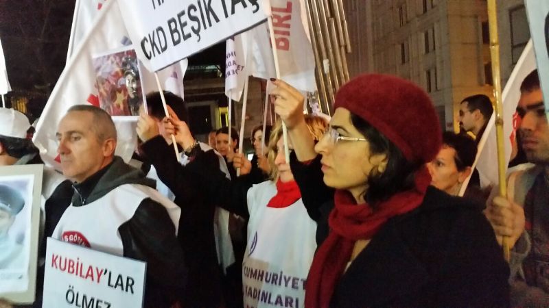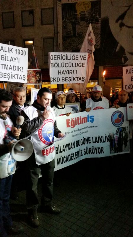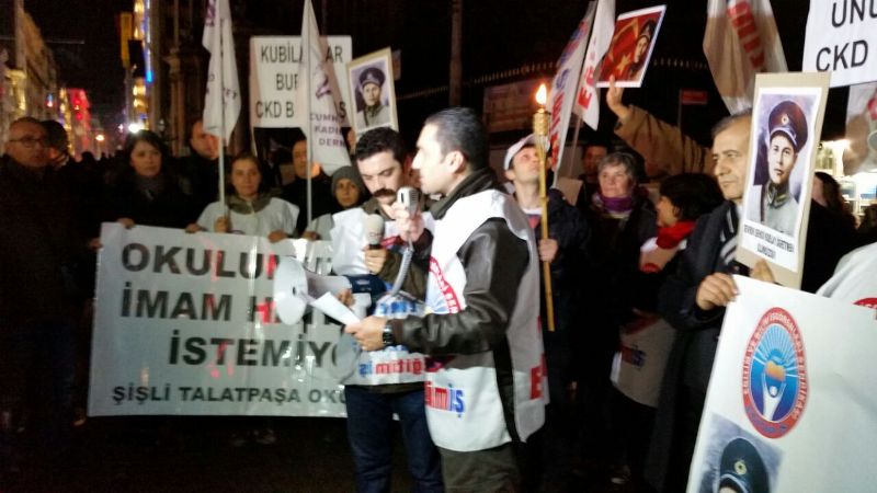 Beyoğlu Tünel’de saat 19.30 sıralarında toplanan grup, 23 Aralık 1930’da Menemen’de şehit edilen Asteğmen Mustafa Fehmi Kubilay için anma yürüyüşü yaptı. Sık sık, “Kubilay’ı unutma, unutturma, “Öğretmene uzanan eller kırılsın şeklinde sloganlar atan grup, ellerinde “23 Aralık 1930 Kubilay’ı unutmadık, Kubilaylar burada, “Gericiliğe ve bölücülüğe hayır yazılı pankartlar eşliğinde Tünel’den Galatasaray Meydanı’na kadar yürüdü.