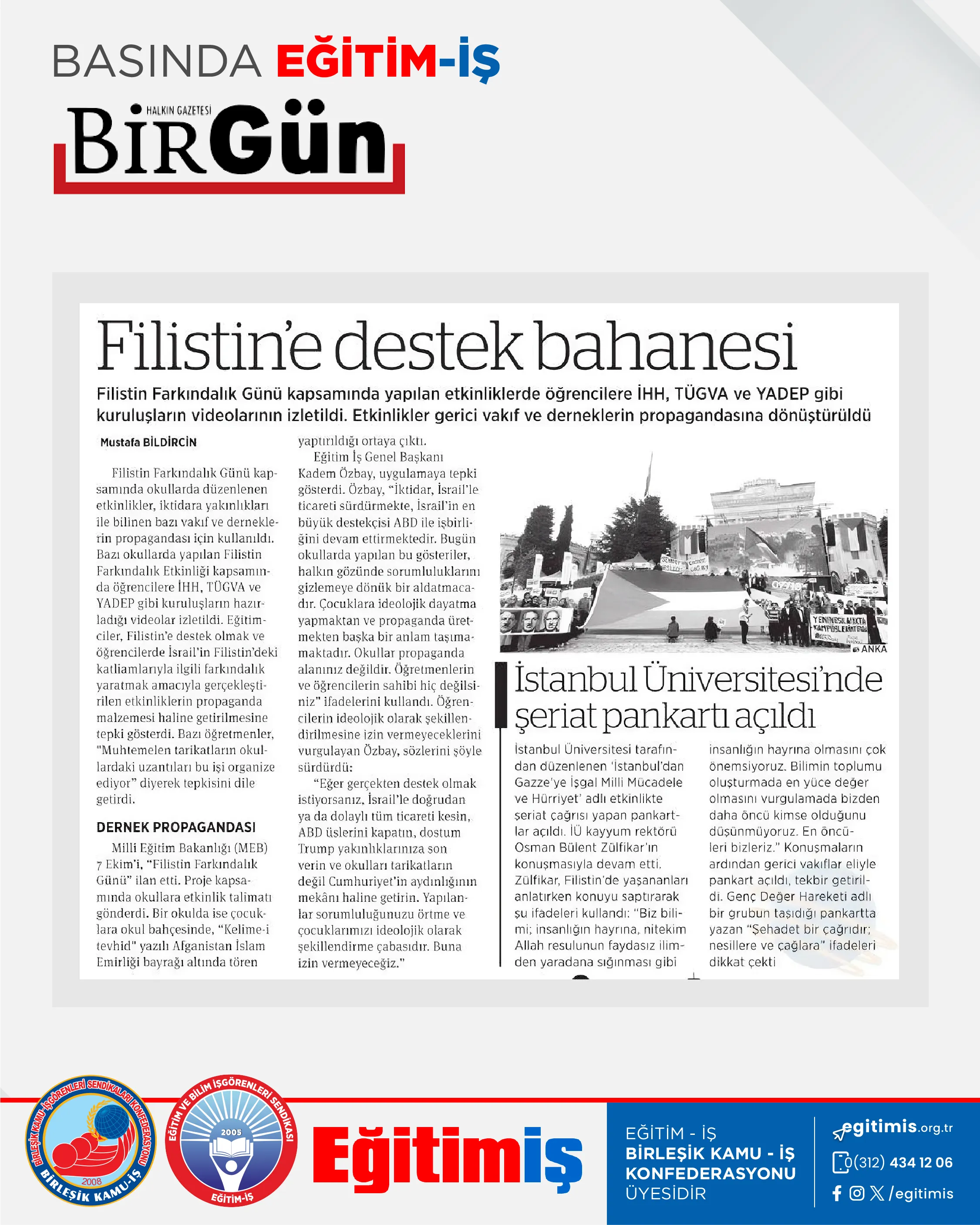 Genel Başkanımız Kadem Özbay, Filistin Farkındalık Günü kapsamınca okullarda düzenlenen etkinliklerde iktidara yakın derneklerin propaganda faaliyeti gerçekleştirmesini, BirGün’den Mustafa Bildircin’e değerlendirdi. “Eğer gerçekten destek olmak istiyorsanız, İsrail’le doğrudan ya da dolaylı tüm ticareti kesin, ABD üslerini kapatın, dostum Trump yakınlıklarınıza son verin ve okulları tarikatların değil Cumhuriyet’in aydınlığının mekanları haline getirin. Yapılanlar sorumluluğunuzu örtme ve çocuklarımızı ideolojik olarak şekillendirme çabasıdır. Buna izin vermeyeceğiz.”