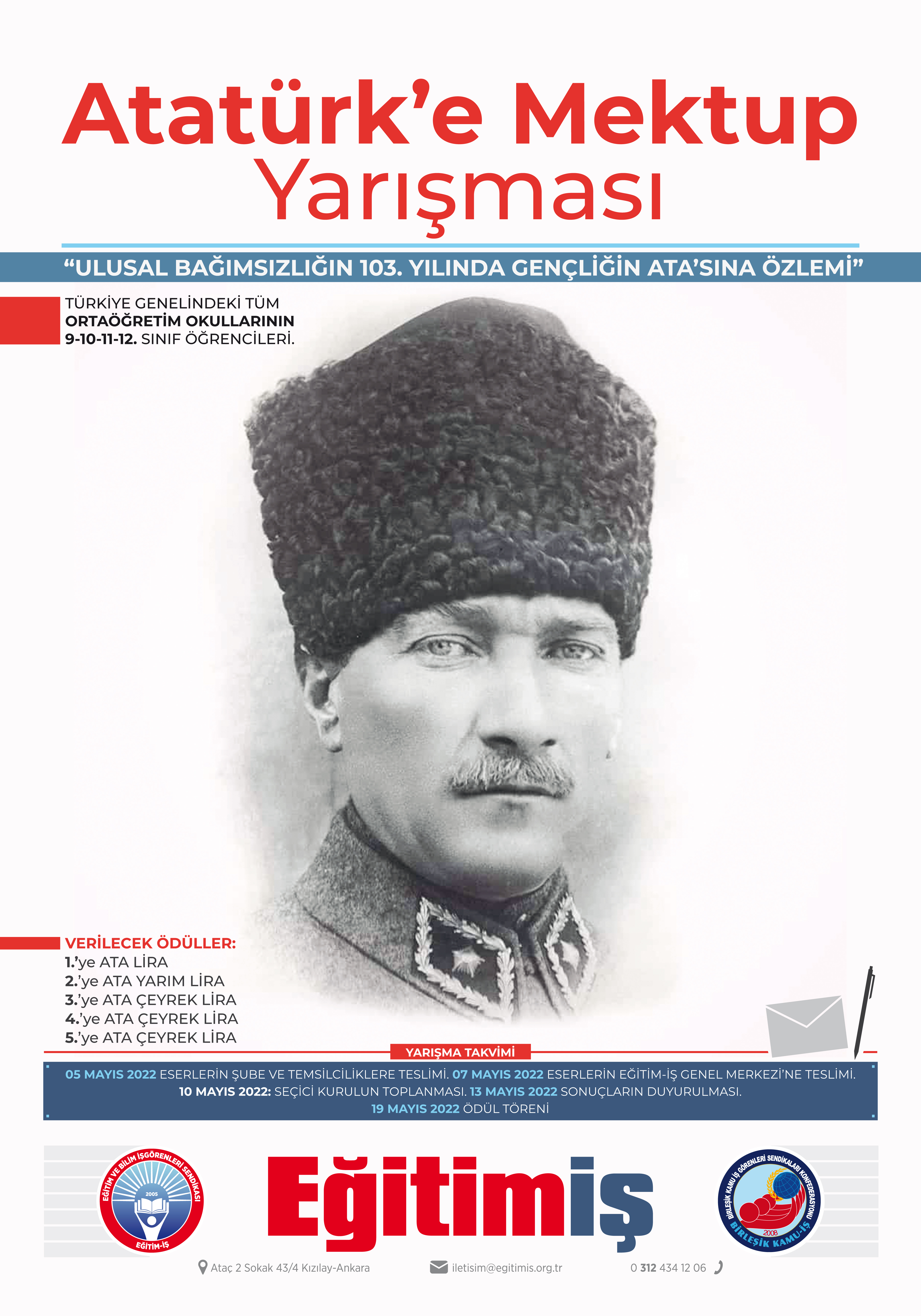 Eğitim-İş’in Büyük Önder Mustafa Kemal Atatürk'ün, Samsun'a çıkarak, bağımsızlık ve özgürlük meşalesini yakmasının 103. yıldönümü nedeniyle düzenlediği mektup yarışmasına yoğun katılım gerçekleşti.