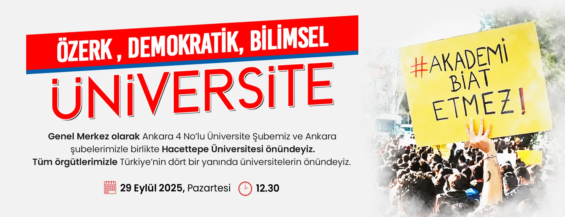 Bu kararlılıkla, 29 Eylül Pazartesi 12.30’da Genel Merkez olarak, Ankara 4 No’lu Üniversite şubemiz ve Ankara’daki tüm şubelerimizle Hacettepe Üniversitesi önünde buluşuyoruz.