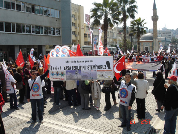 Bu çerçevede 27 Mart 2012 tarihinde gerçekleşen iş bırakma eylemimiz, yurt çapında geniş katılımla gerçekleşti. Türkiye’nin dört bir yanında alanlara, sokaklara çıkan üyelerimiz halkın da desteği ile “4+4+4 dayatmasına hayır” dedi.